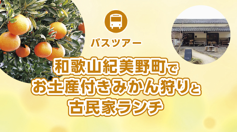 Read moreフルーツ王国和歌山でみかん狩りを楽しみましょう! 紀美野町のみかん園では時間内みかん狩り食べ放題をお楽しみ頂きます。さらに約3Kgのみかんをお持ち帰り! 昼食は米蔵を改装した雰囲気のある「もみの木食堂」さんで、地元野菜を