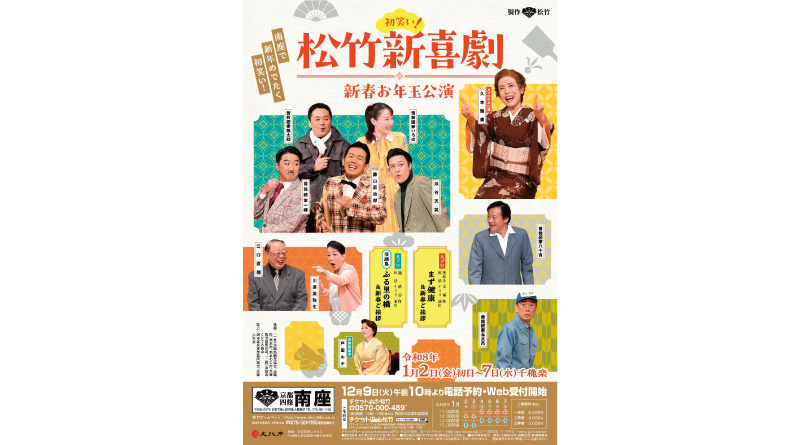Read more2026年初笑いは南座で!松竹新喜劇で笑って泣いて心温まるお正月をお過ごしください。 【出演】 ゲスト:久本雅美(Aプロのみ) 藤山扇治郎、渋谷天笑、曽我廼家一蝶、曽我廼家いろは、曽我廼家桃太郎 ほか 【演目】 Aプロ
